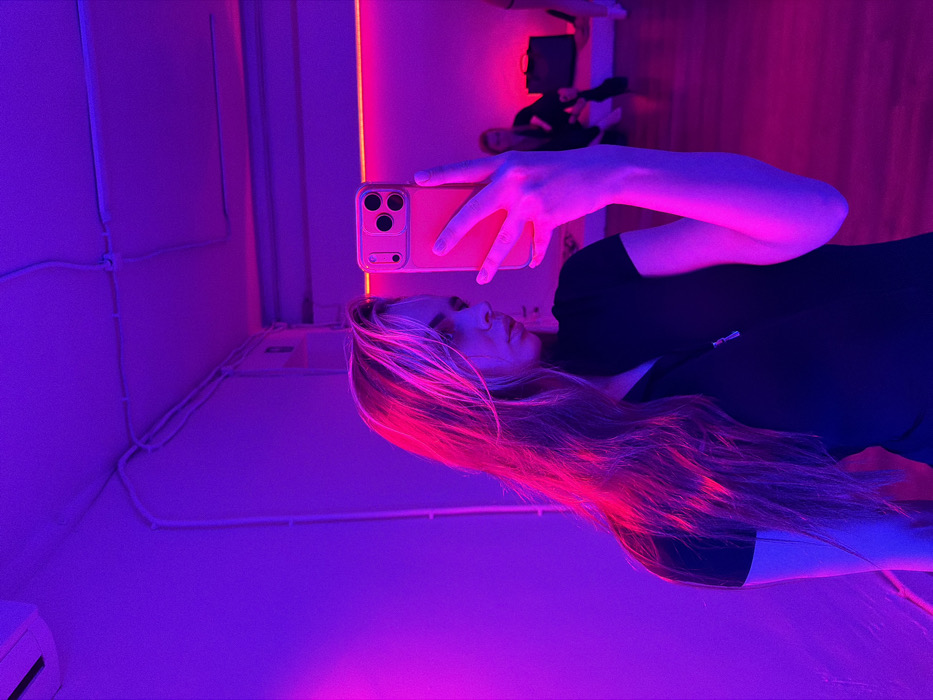 A fair-skinned individual holds a coral-colored smartphone in their left hand, angled upwards for a selfie. The person has long, blond hair, illuminated with red and pink hues from the surrounding lights. They wear a dark shirt. The background features a wall with visible wiring, and a vertical strip of light creates a reddish-orange glow, while the overall room is bathed in purple light. A blurred figure stands further back in the scene.
