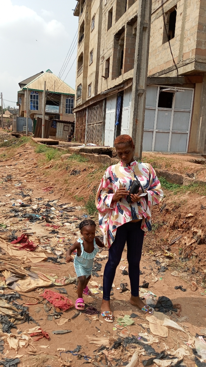 The image depicts an outdoor scene in Onitsha, Nigeria, featuring two individuals on a heavily littered, reddish-brown dirt path. **Environment:** The ground is an unpaved, uneven dirt path covered extensively with various discarded items, including black plastic bags, transparent plastic sheeting, fabric scraps (red, beige, dark green, black), and other indistinct debris. Dry, sparse vegetation is visible amidst the litter. In the immediate background to the right stands a multi-story concrete block building, appearing partially constructed or unfinished, with exposed concrete walls and open window voids on upper floors. The lower section features white-framed windows and a blue curtain. A concrete utility pole stands vertically in front of this structure, with multiple black electrical wires extending from it across the sky. Further in the background to the left, another building with a distinctive green metallic corrugated roof and light blue-framed arched windows is visible. A sign below its windows appears to read "M.U. OBEAGU." Additional less distinct structures are visible in the far background. The sky is overcast or hazy. **People:** An adult female stands slightly right of center, facing slightly left of the viewer, with her gaze directed downwards. She has a medium-dark complexion and short, reddish-brown hair. She wears a loose-fitting, long-sleeved blouse with a high collar, patterned in abstract strokes of white, pink, blue, beige, and black. Her lower attire consists of dark blue leggings or pants. On her bare feet, she wears ornate, multi-colored slides/sandals with decorative embellishments. She holds a dark-colored, rectangular object (possibly a wallet or small electronic device) in both hands, appearing to examine or operate it. To her left and slightly in front, a young female child walks. The child has dark skin and small braids in her hair. She wears a light blue or mint green sleeveless romper with ruffled shoulder straps. Her feet are clad in pink plastic sandals/flip-flops with a small yellow/gold embellishment. Her left hand is near the adult's right leg, and she appears to be walking forward, slightly ahead of the adult.