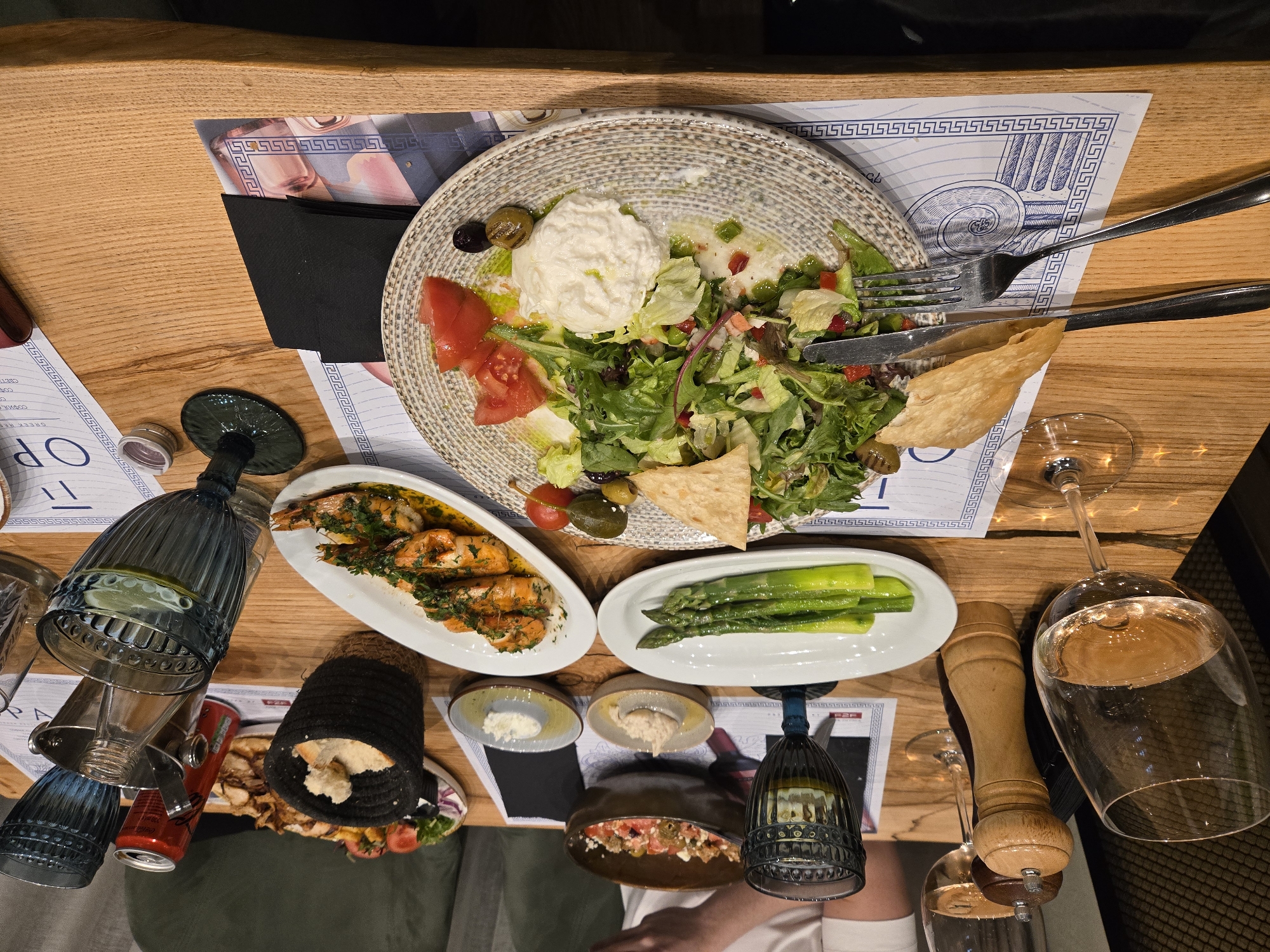The image depicts a table laden with food, likely in a restaurant setting. The dishes include a salad with a large white cheese portion, grilled shrimp, and asparagus. There are also small bowls with condiments and a basket with bread. Cutlery is visible, and drinking glasses are scattered around, some with liquid. The table is wooden, and a placemat with Greek-themed illustrations is visible under the salad plate. A restaurant menu is seen near an ice bucket with glasses. The lower part of the image suggests that at least one person is seated at the table, partially visible at the bottom edge. The location is not specified, and it is not possible to determine if it is in Sofia, Bulgaria from the image alone.