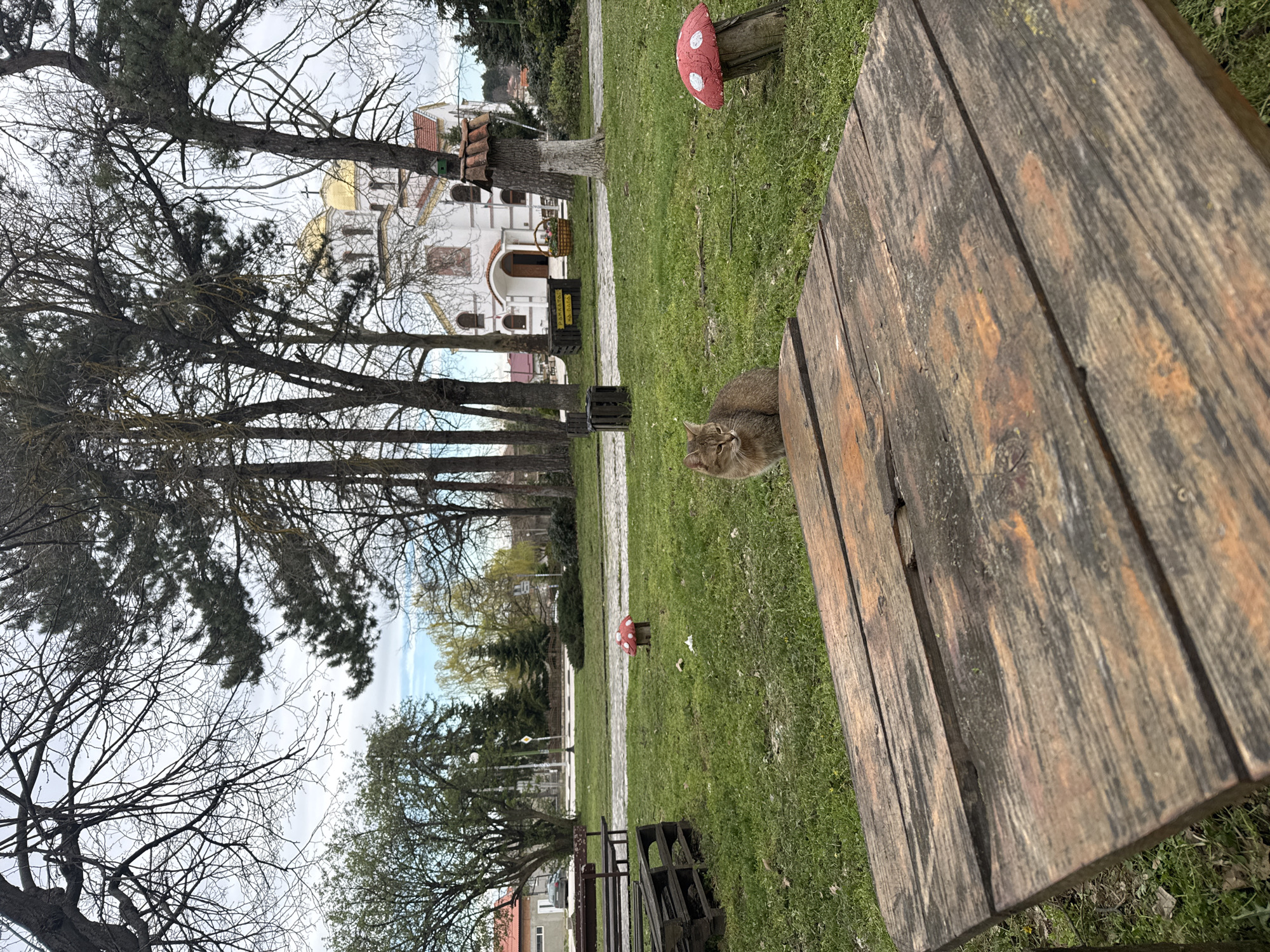 The image depicts an outdoor scene in Tervel, Bulgaria. A wooden picnic table dominates the foreground, partially obscuring the view. A cat rests on the edge of the table. In the background, a white church with a golden dome is visible, framed by bare trees. A grassy area is dotted with decorative mushroom-shaped objects. A path leads towards the church. In the far background, hints of residential buildings and greenery are visible. The sky is overcast. The overall setting suggests a park or recreational area near the church.