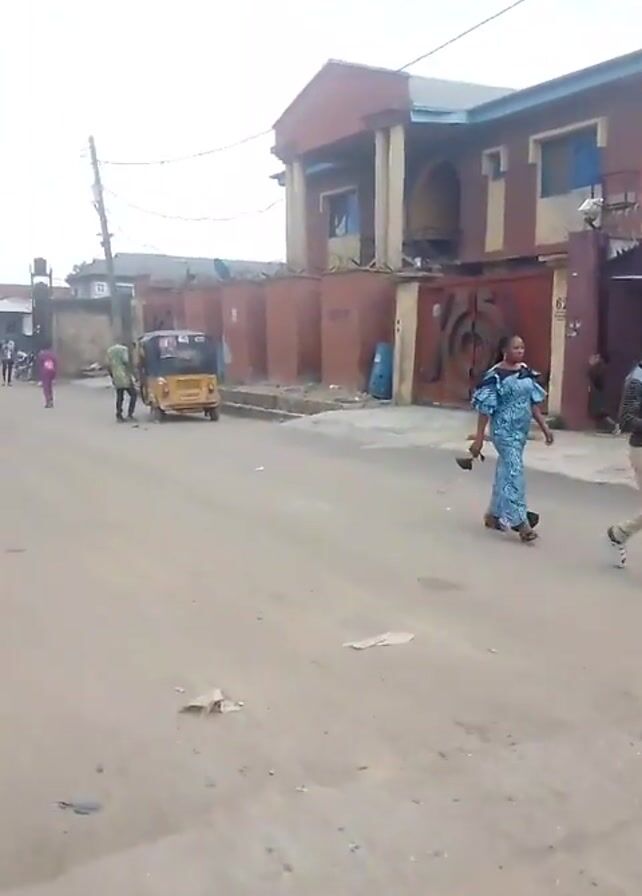 street scene in an urban area, possibly in Africa based on the architecture and vehicles