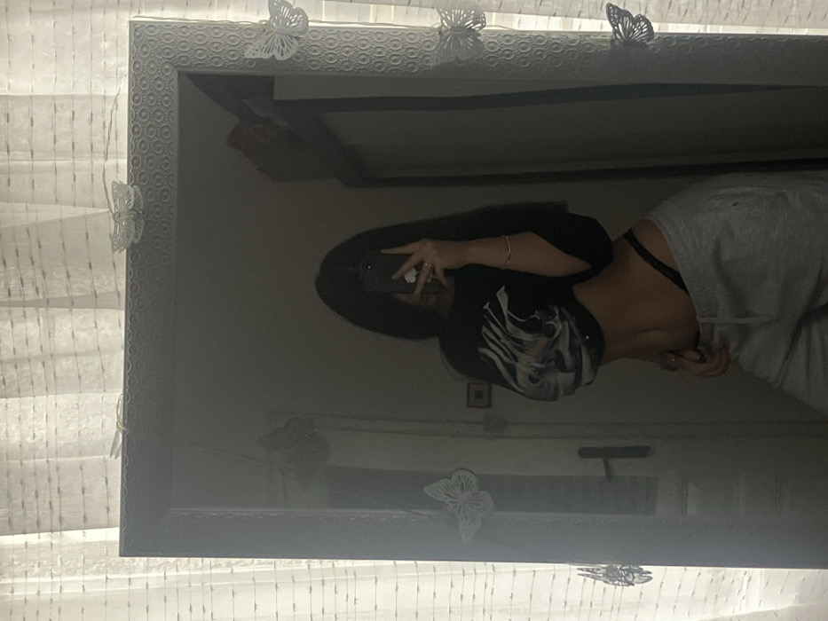 The image depicts an indoor scene, specifically a mirror selfie taken by an individual. The precise location within the city of Plovdiv, Bulgaria, cannot be determined from the visual evidence. A person with long, dark hair is reflected in a rectangular mirror, with their face obscured by a black smartphone held in their right hand to capture the image. The person is wearing a dark, short-sleeved crop top featuring a light-colored graphic design on the chest, which exposes the midriff. Below, they wear light grey sweatpants, and a black thong-style undergarment is visible above the waistband of the sweatpants. A ring is present on the right hand holding the phone, and a plain bracelet is visible on the left wrist. The mirror has a textured, possibly white or light grey, frame adorned with multiple decorative white butterfly decals, some attached to the frame itself and others visible as reflections within the mirror. To the left of the mirror, a light-colored, sheer curtain with subtle horizontal striped patterns is visible, suggesting a window behind it. To the right, within the mirror's reflection, a portion of a light-colored wall, a dark brown door, and a dark door handle are discernible. An indistinct object or item rests on a surface in the upper right quadrant of the reflected background.