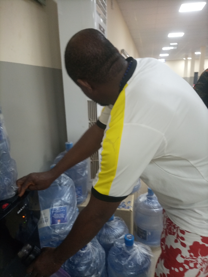 A dark-skinned man in a white and yellow shirt with red floral print shorts is shown filling a cup with water from a black water dispenser. Several large, unopened water bottles surround the dispenser on the floor, some still wrapped in plastic. The background consists of a beige wall with a gray section, an air conditioning unit, and fluorescent lights on the ceiling.