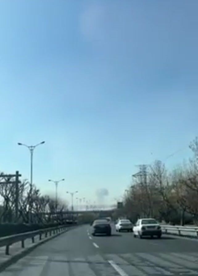 car driving on a highway with other vehicles. The sky is bright blue with a light haze. There are street lights and bare trees lining the road. In the distance, a faint plume of dark smoke is visible. There are highway signs and power lines alongside the road.
