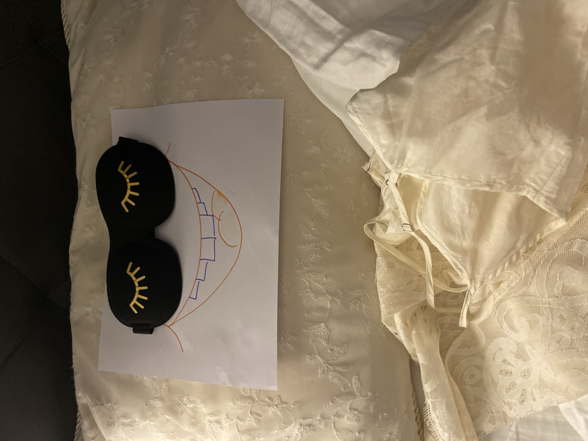 A photograph shows a bed with a white comforter, a white piece of clothing, a sleep mask, and a drawing on a white piece of paper. The sleep mask is black and has golden eyelashes stitched on. The drawing is of a face. The white piece of clothing is made of lace and has straps. The location is not determinable.
