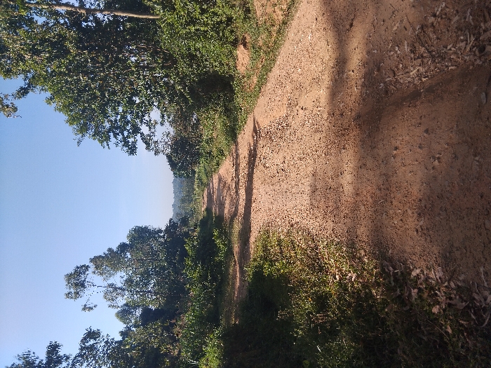 A dirt road curves through a lush, green landscape under a clear, blue sky. Trees and vegetation line both sides of the road, creating a natural tunnel. Shadows cast by the trees fall across the road's surface, adding depth and texture. In the distance, a gentle hill can be seen. The image is captured from a slightly elevated perspective, emphasizing the road's path into the distance.