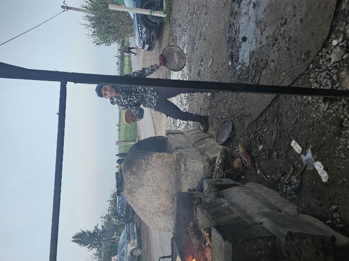 A young man stands near a large, dome-shaped oven, holding a round piece of bread in one hand and a cooking pan in the other. He wears a patterned jacket, dark pants, and a cap. The oven sits next to a muddy ground with scattered debris. A road with parked cars and green fields stretch in the background. A dark metal structure frames the image on the left side.