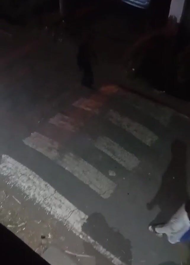 At night, a person in a white and blue jacket is lying down on a crosswalk as a dark-clothed person walks across the street