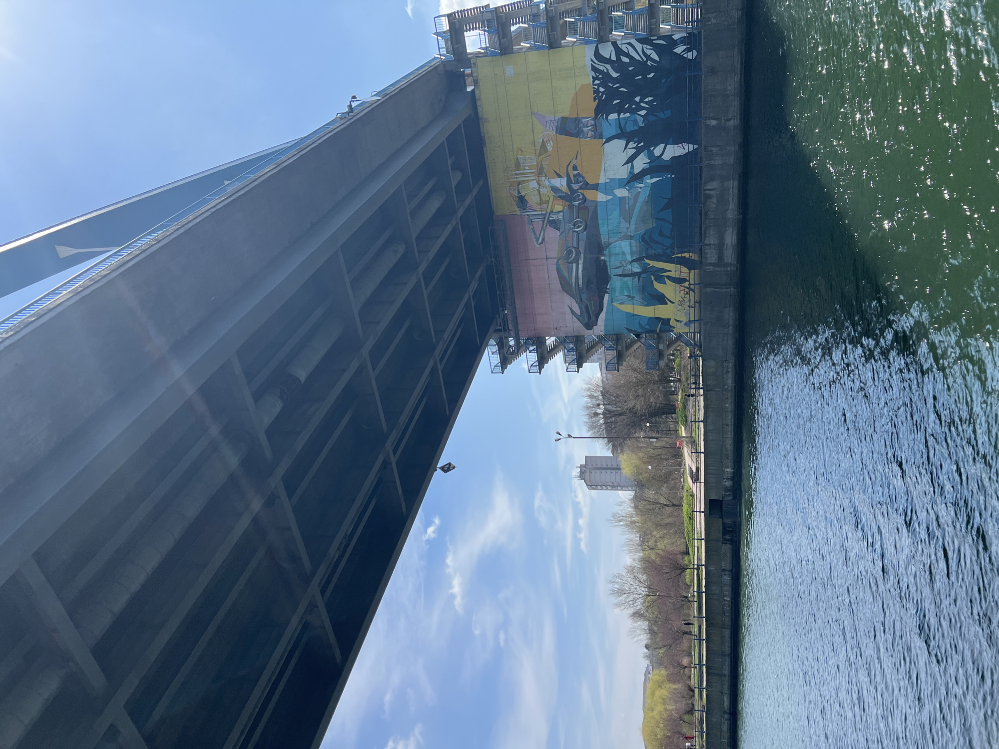 The scene depicts the underside of a large concrete bridge spanning a body of water in Medgidia, Romania, under a bright, partly cloudy sky. The bridge's grey, ribbed underside and superstructure occupy the upper portion of the frame, with a visible lens flare near the top center. On the right side, a substantial concrete abutment of the bridge features a large, multi-paneled mural. This artwork displays a stylized, dark-colored object resembling a futuristic vehicle or craft, set against a background gradient of pink and yellow. Below this, dark blue and black organic, possibly plant-like, forms are depicted. External metal staircases with blue railings are attached to both sides of this painted abutment, providing access along the bridge structure. The lower half of the image presents a body of rippled, dark green water, exhibiting numerous glinting reflections from sunlight. A concrete retaining wall defines the far bank of the water. Above this wall, a paved pathway with blue safety railings extends horizontally. Several indistinct human figures are visible on this pathway, appearing to be walking or standing. Beyond the pathway, a park-like area contains deciduous trees, some with visible early spring blossoms or light green foliage. In the far background, a tall, multi-story, light-colored building, likely an apartment block, is visible, along with a streetlight. The overall illumination indicates bright daylight conditions.
