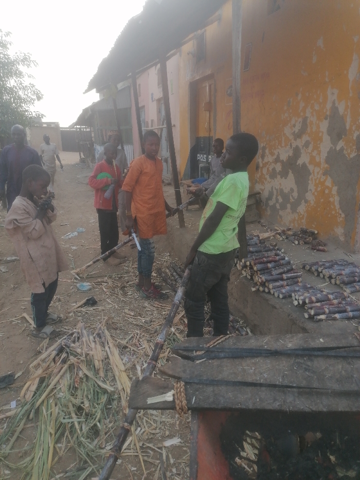 In an outdoor setting, several individuals, primarily children, are gathered around what appears to be a sugarcane processing or vending area. Some of them are holding stalks of sugarcane. The area has sugarcane debris and cut pieces of sugarcane arranged neatly. The background features a dilapidated building with peeling paint and a P.O.S. sign. Other individuals are walking in the background down a dusty road.