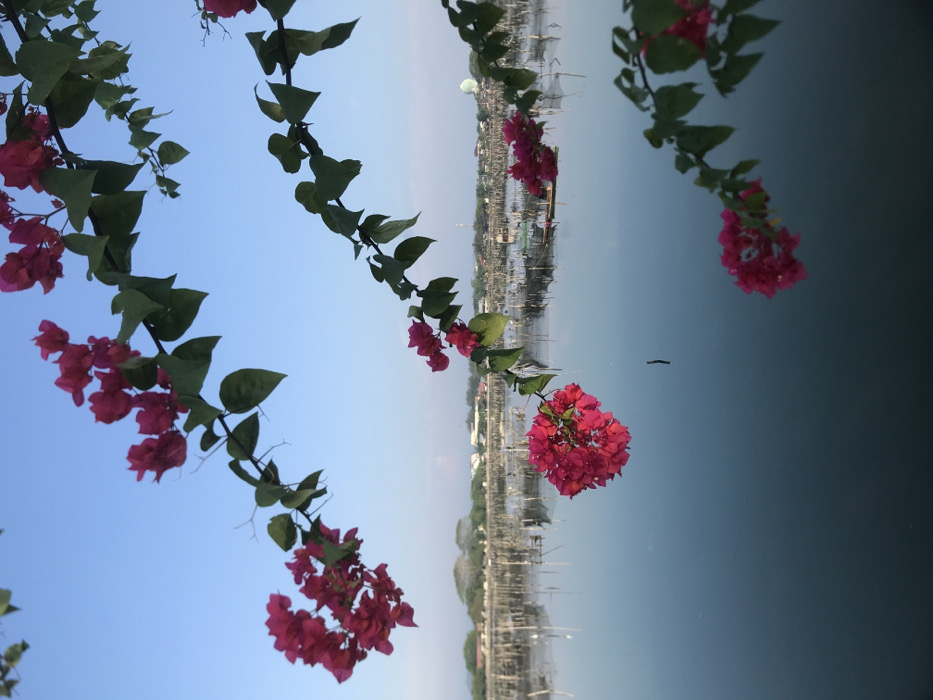 The image depicts a tranquil coastal scene in Lhokseumawe, Indonesia. The foreground is framed by several branches of bougainvillea, adorned with vibrant magenta-pink flowers and green leaves, extending from the top, left, and bottom right into the frame. The midground features a calm body of water, likely a lagoon or bay, reflecting the sky and distant structures. Numerous thin, vertical wooden poles, consistent with aquaculture or traditional fishing net supports, are distributed across the water's surface. A small, light-colored boat with a pointed bow and a lateral extension, possibly an outrigger or supporting structure, is visible on the water in the mid-right portion of the frame. In the background, a distant shoreline with low-rise buildings and scattered vegetation is visible above the water. The horizon line is low, giving way to a clear, light blue sky that dominates the upper portion of the image. No individuals are visible, and the scene is static.
