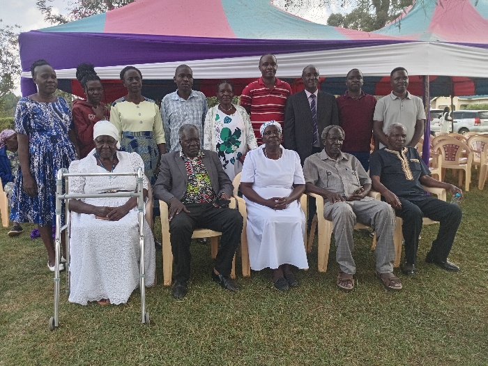 A group of fifteen individuals is photographed outdoors on a grassy area under a multi-colored tent canopy (pink, blue, purple, white sections) in Ngenyilel ward, Kenya. The individuals are arranged in two rows, posing for the camera. The front row consists of six seated elderly individuals in light-colored plastic chairs. From left to right: an elderly woman in a white dress and headscarf, seated with a silver walker positioned directly in front of her; an elderly man in a gray suit jacket over a multi-colored shirt; an elderly woman in a white dress; an elderly man in a gray shirt and trousers, holding a dark object; and an elderly man in a dark blue, gold-embroidered shirt, holding a clear plastic bottle. The second row comprises nine standing adults, varying in age and attire, including patterned dresses, polo shirts, and a suit. In the background, beyond the tent, trees are visible, along with additional empty plastic chairs and a partially visible white vehicle. All subjects are facing forward towards the camera.