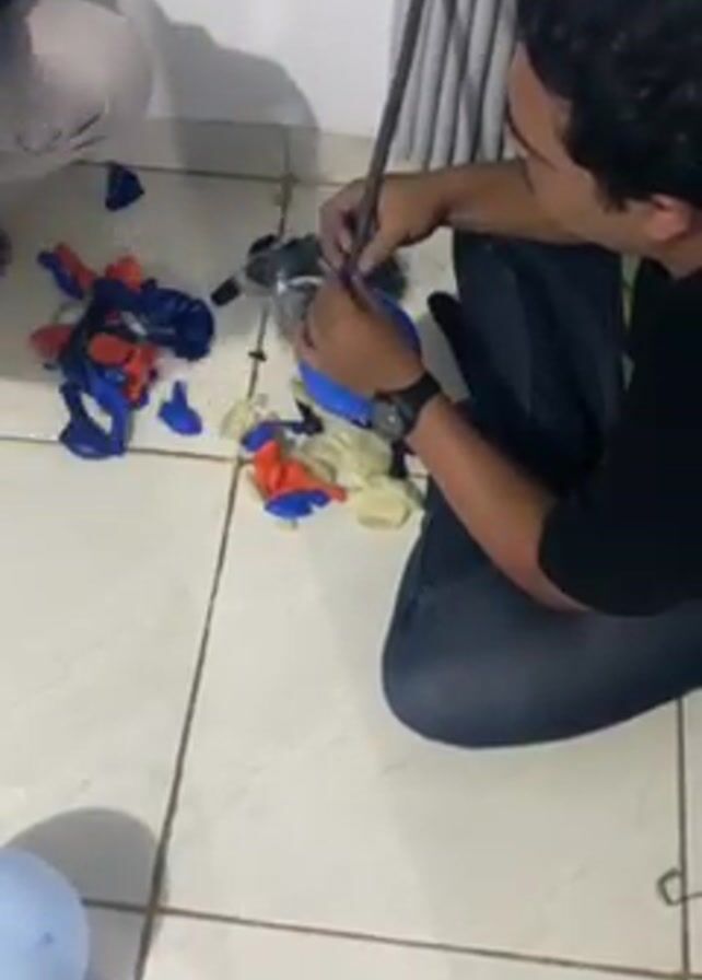 Here is a detailed description of the video: The video shows two men on a tiled floor, preparing balloons