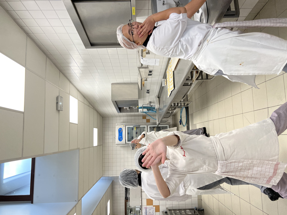 In a brightly lit, tiled kitchen, three individuals dressed in white chef's coats and hairnets are captured playfully posing