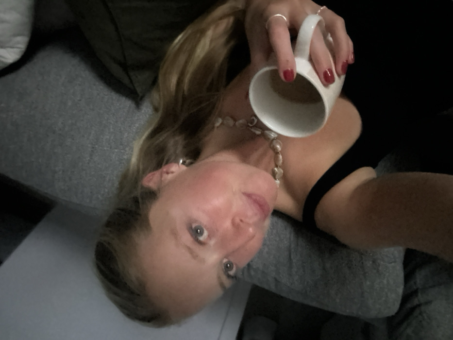 The image depicts a single female subject in an indoor setting. The specific city of Bulli, Australia, cannot be confirmed from the visual information provided. The subject is a young adult female with fair skin, light-colored eyes, and long, light brown or blonde hair. She is seen from an overhead angle, positioned against a grey, textured fabric background, likely a sofa or bed. She wears a dark, possibly black, tank top or camisole. Accessories include small, silver-toned hoop earrings, a necklace composed of irregularly shaped, light-colored beads (resembling pearls or shell pieces), and two silver-toned rings on her left hand. Her fingernails are painted with dark red polish. She holds a white ceramic mug containing a light brown liquid, consistent with coffee or tea, in her left hand. The subject is looking directly towards the camera with a subtle expression. The immediate environment consists of dark and grey fabric textures, suggesting a domestic interior.