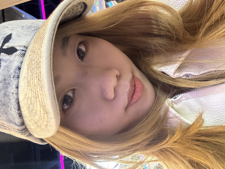 A close-up selfie captures a female subject with East Asian features, located indoors in Jiulongpo District, China. The subject directly faces the camera, wearing a light-colored, possibly white or cream-toned, textured jacket with a partially unzipped silver-colored zipper. On her head is a baseball cap featuring a light blue distressed denim crown, which bears a dark symbol resembling an asterisk, and a light tan brim. Her long, light brown hair is visible, framing her face and falling over her shoulders. Her eyes are dark brown, and her lips display a natural pink hue. The background is significantly blurred, indicating a shallow depth of field and an indoor environment with artificial lighting, including diffuse pink and white illumination. No other individuals or direct interactions are visible.