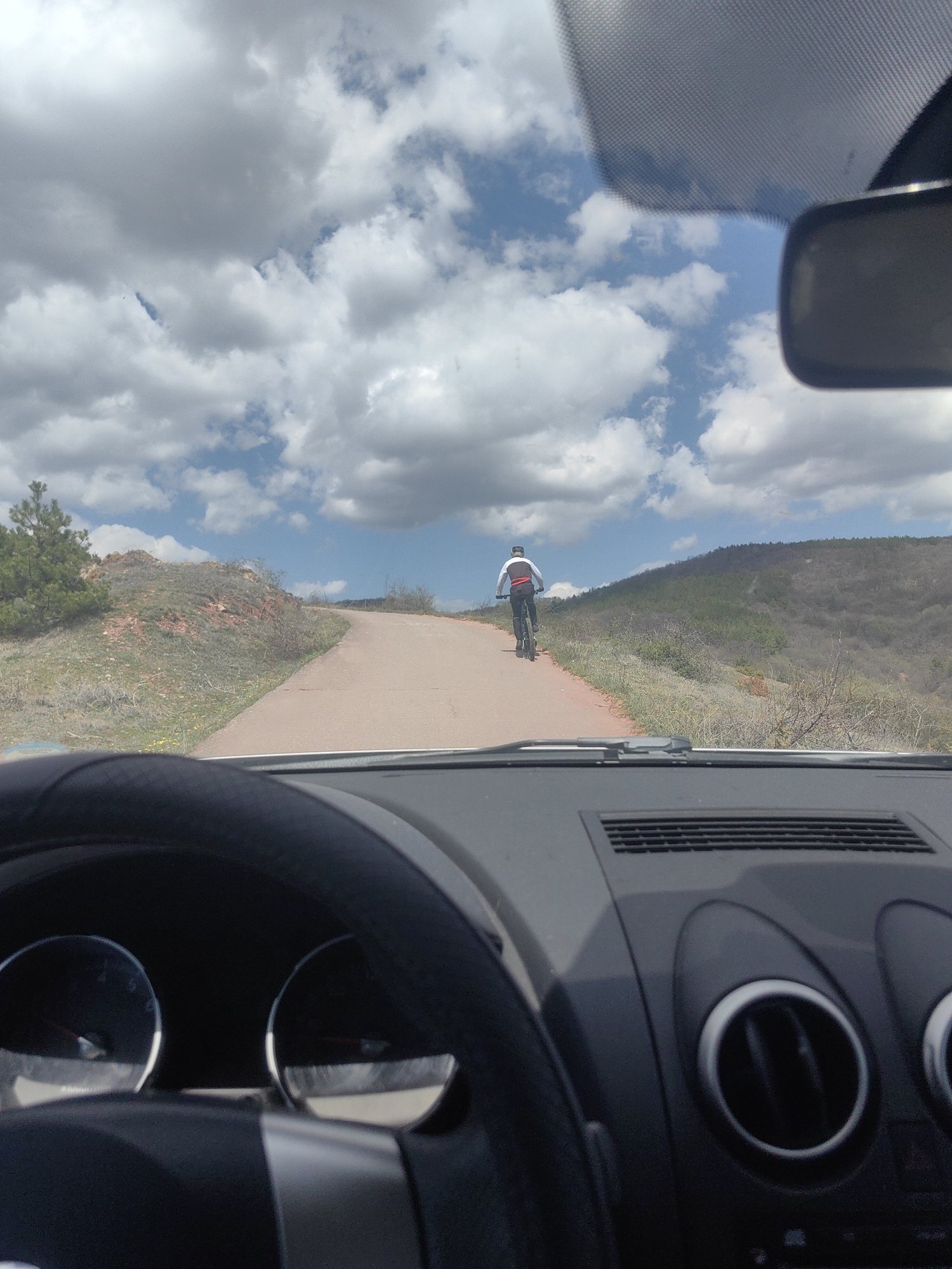 The image, taken from inside a vehicle, shows a cyclist on a paved road