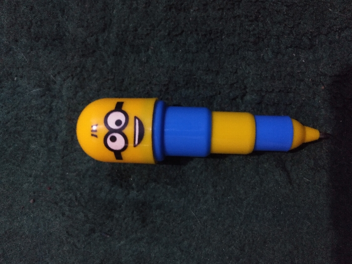 - "A single Minion-themed writing instrument, primarily yellow and blue, is positioned centrally against a dark green textured background" by FM-AWsTN2, licensed under CC BY 4.0