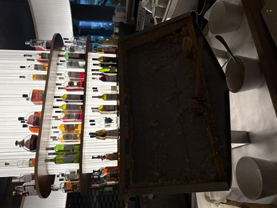 The image depicts an interior scene within a commercial establishment in Barcelona, Spain, identified as a bar or restaurant. The upper half of the frame presents a three-tiered, curved wooden bar shelf displaying numerous glass bottles of various alcoholic spirits. These bottles, containing liquids of diverse colors (amber, red, green, clear), are silhouetted against a bright, vertically textured, backlit white screen, which serves as a luminous backdrop. The lower half of the image showcases a self-service honey station. A large, dark-framed, rectangular structure, angled downwards and supported by two metallic, angular stands, contains visible fragments of honeycomb and viscous golden honey. A small wooden honey dipper or fork-like tool is present within the honey, indicating its active use. Directly beneath the lowest point of the angled honey frame, a small, white ceramic bowl is positioned to collect dripping honey, and a silver spoon rests inside it. Another identical white ceramic bowl, also containing a spoon, is situated to the right. The counter surface beneath these items is covered with a white paper or cloth lining. Faint outlines of kitchen or service equipment are discernible in the right background. The overall lighting is dim, with the liquor display significantly brighter due to backlighting. No individuals are visible in the scene.
