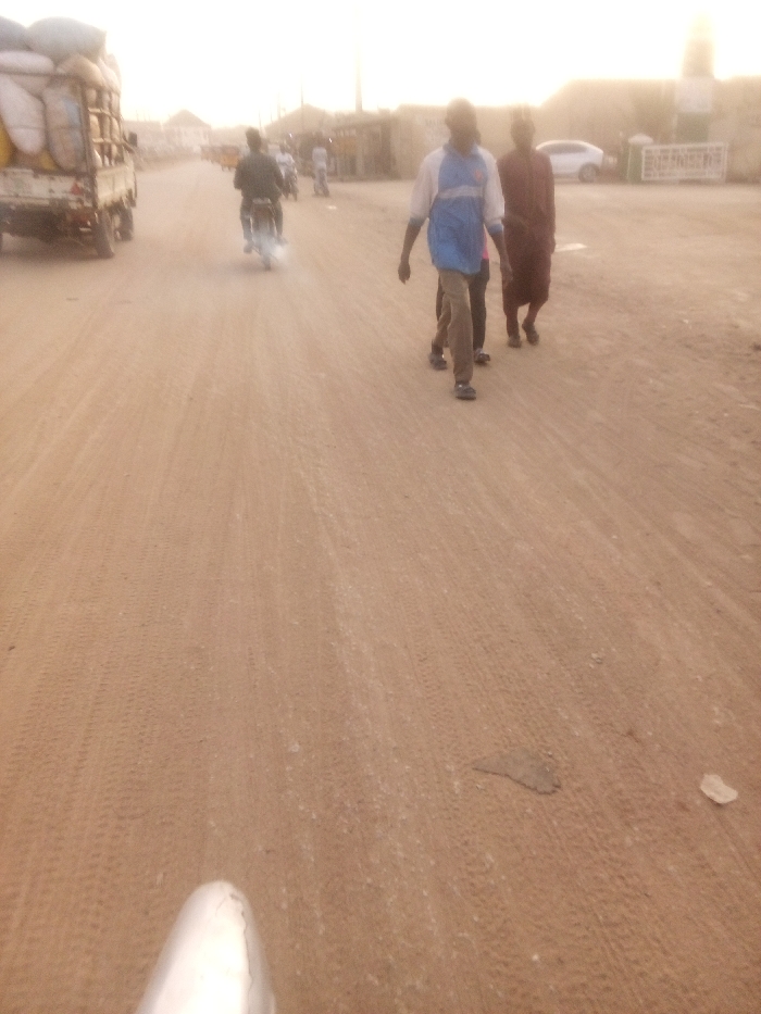 A sandy road scene showcases a truck loaded with goods to the left. Further down, a person rides a motorcycle, and two individuals walk along the road. A white car is visible on the right. The landscape is bathed in the golden light of either sunrise or sunset, creating a hazy atmosphere.
