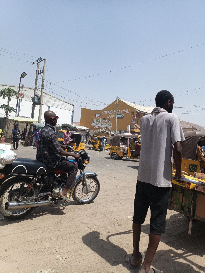 The scene depicts a sunny, outdoor environment in Fagge C, Nigeria, characterized by unpaved ground and bustling activity