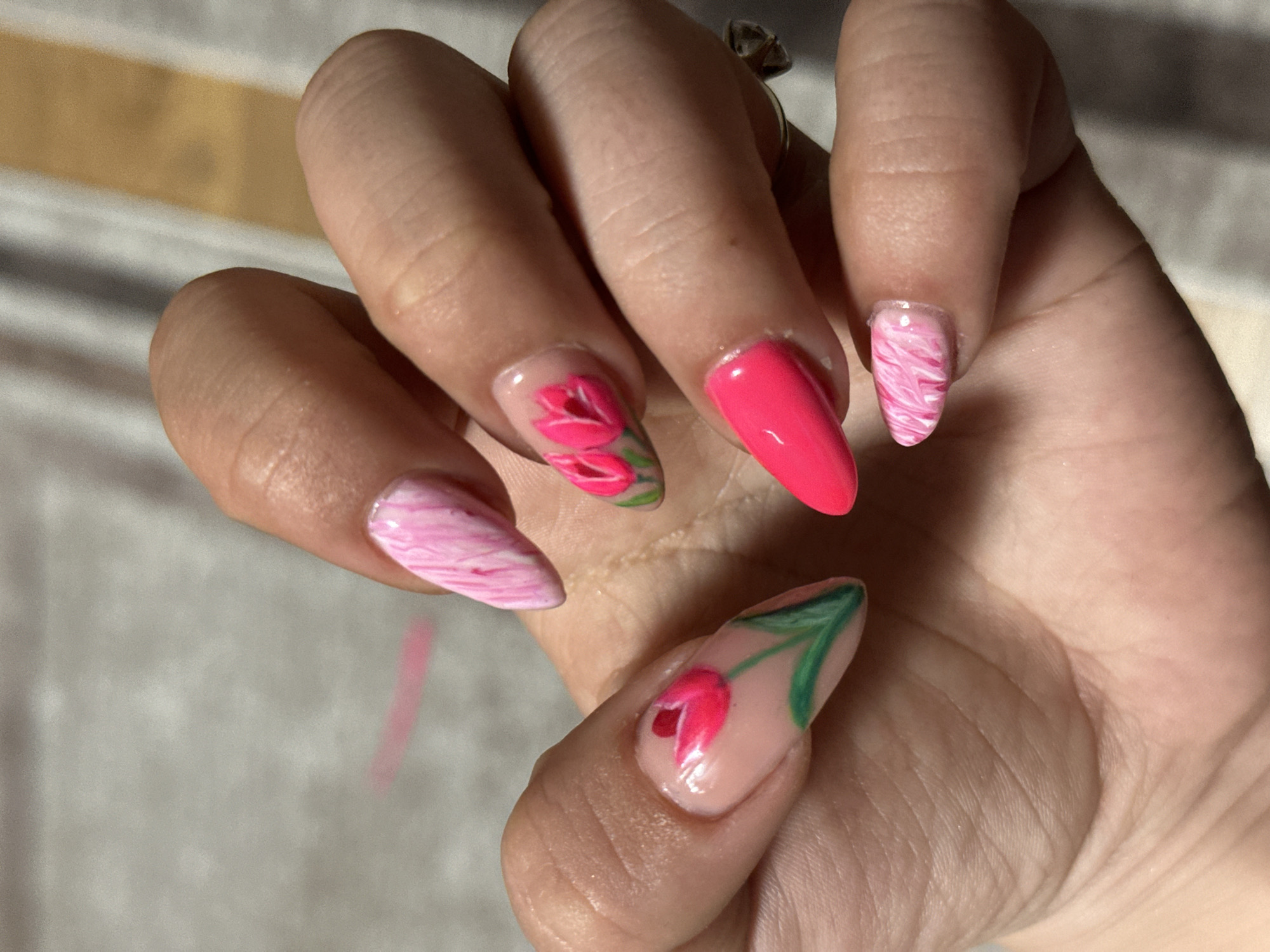 The image depicts a close-up, top-down view of a single human left hand displaying artificial fingernail extensions in Skala, Bulgaria. The hand is posed with fingers slightly splayed and curled. All five nails are almond/stiletto-shaped. The index finger features two small, closed pink tulips with green stems and leaves on a clear base. The middle finger is painted a solid, opaque hot pink. The ring finger displays a single larger, closed pink tulip with a green stem and leaves on a clear base, and a silver-colored ring with a clear stone is worn at its base. The thumb and pinky finger nails are decorated with a marbled pattern of varying shades of pink and white. The background consists of a blurred, light gray textile surface, possibly fabric, with faint horizontal tan stripes and a thin, blurred pink line visible towards the upper left. Lighting is even, without harsh shadows.