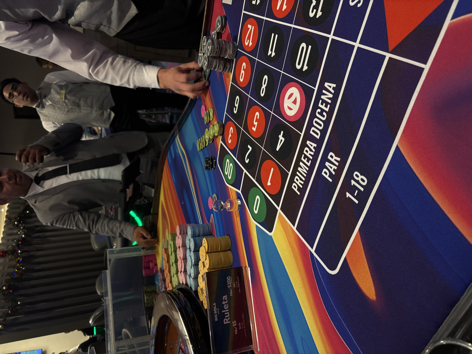 A roulette table displays the numbers 0, 00, and 1-12. Chips of various colors and denominations are stacked on the table, indicating bets. Text on the table includes "PRIMERA DOCENA," "PAR," and "1-18." A sign reads "BIG BOLA Ruleta," with minimum and maximum bet amounts of $5 and $200 respectively. Two casino employees are visible; one in a white shirt and vest and another in a gray suit. A roulette wheel is partially visible on the side.