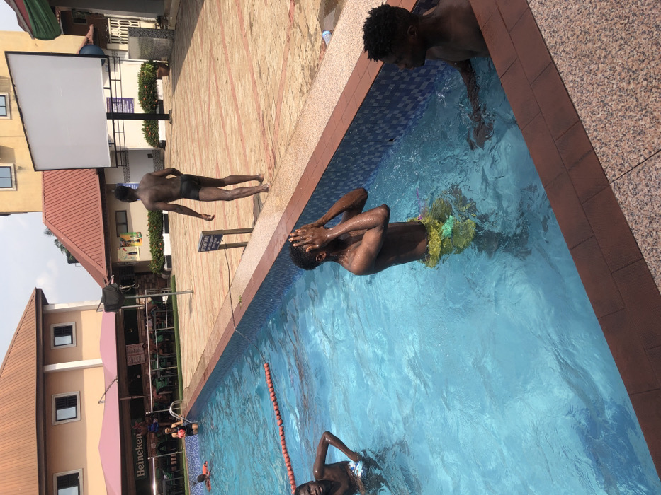 People are enjoying a sunny day at the pool. One person is standing near the edge, while another covers their face in the water. A third person treads water at the pool's edge. Several others swim in the pool. Buildings, plants, and a Heineken advertisement are visible in the background.