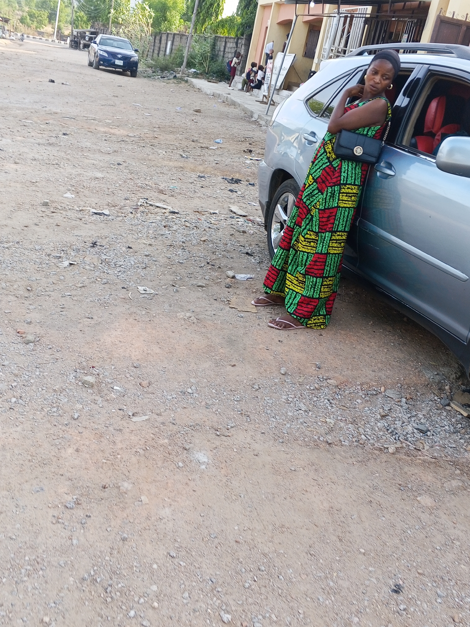 An adult female is observed standing on an unpaved road in Otokiti, Nigeria, leaning against a parked light-grey Lexus RX SUV with its front passenger door ajar