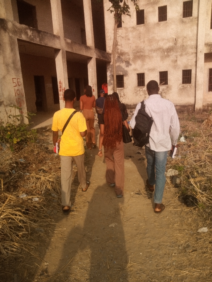 A group of people walks along a dirt path leading towards a dilapidated building. The person at the front wears a yellow shirt and grey pants. Behind, a woman with long braids wears brown pants. A man with a white shirt and jeans follows, carrying a black backpack. The building is two stories high, with many windows and a weathered exterior. The ground around the path is covered in dry grass and debris. The scene appears to be captured in bright sunlight.