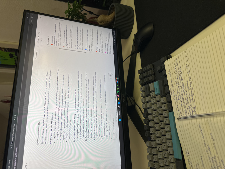 A person is working on a computer with an ASUS monitor, using a keyboard and mouse. The screen displays a document with the heading "Думал на протяжении 325" (Thought for 325). The document discusses why one shouldn't buy Instagram followers and suggests alternatives like targeted ads, collaborations, content strategy, profile optimization, and giveaway collaborations. A notepad with handwritten notes sits next to the keyboard, with a pen resting on top. A plant in a gray pot is visible in the background.