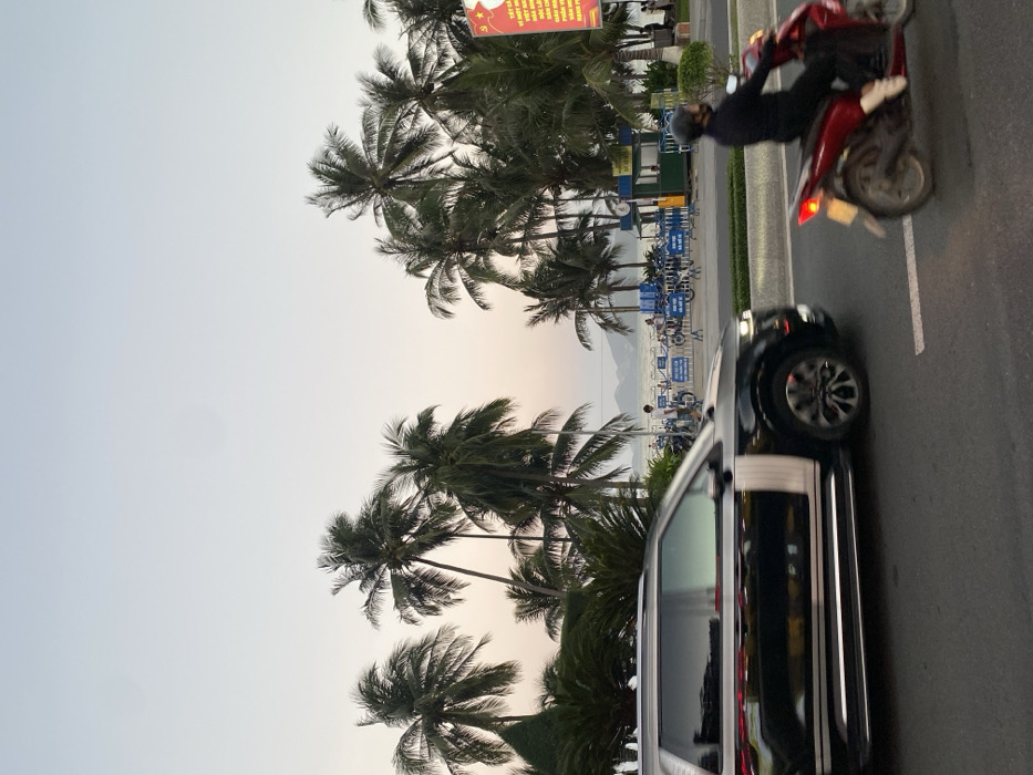 An outdoor scene captured at dusk or late afternoon depicts a bustling coastal road in Nha Trang, Vietnam. In the foreground, a black multi-purpose vehicle (MPV), possibly a Kia Carnival, travels from right to left on a paved asphalt road, its front half visible, featuring a distinct white striped graphic on its side. To its right, a person wearing a dark helmet and dark clothing operates a red scooter/motorcycle, also moving from right to left. A white painted line is visible on the road surface. The midground features a landscaped median strip separating the road from the beachfront area. Beyond the median, numerous tall, mature palm trees dominate the view, with dense green foliage. Beneath the palm trees and extending towards the water, a series of blue metal barriers are arranged in rows, possibly for crowd control or demarcation. Several indistinct individuals are visible on the sandy area, some standing, others near what appear to be blue bicycles or shared bike stations. A small, blue-roofed kiosk is present on the right, and a red banner with white Vietnamese text and a yellow star (reminiscent of the Communist Party of Vietnam emblem) is partially visible on the far right. In the background, the calm waters of the ocean or bay are visible, extending to a distant horizon where multiple mountains or hills are silhouetted against a gradient sky transitioning from a pale blue overhead to a soft peach-orange hue near the horizon.