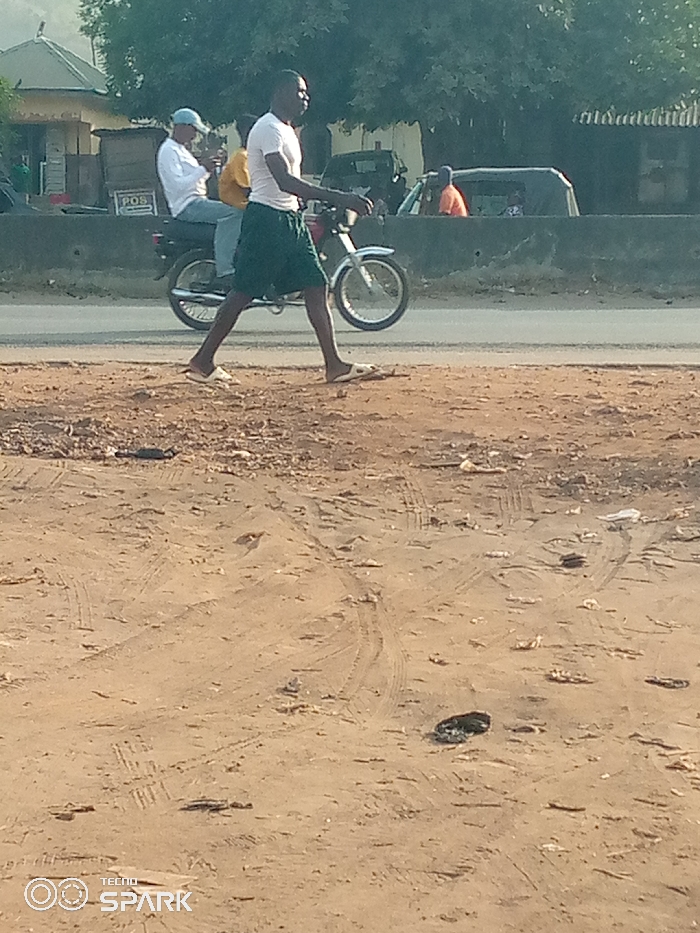 A man in a white shirt and green shorts walks along a dirt road, holding a silver motorcycle. Behind him, two people ride another motorcycle. Other vehicles are visible in the background, including a car with a person wearing an orange shirt. A low concrete barrier separates the road from the foreground. The dirt road in the foreground has tire tracks and scattered debris. "TECNO SPARK" is displayed in the bottom left corner of the image.