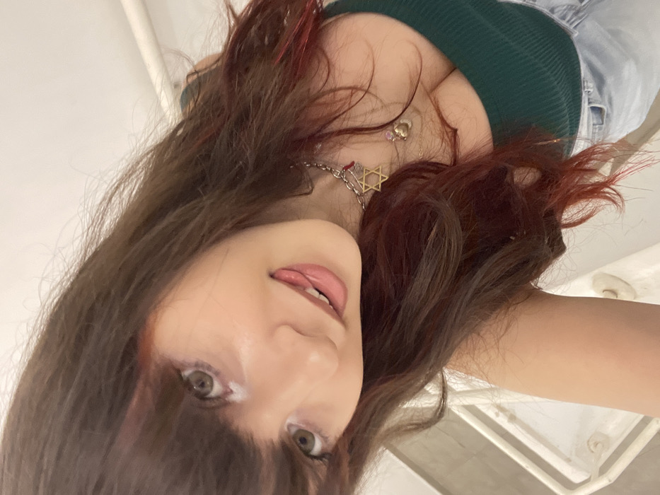 An upside-down angled shot of a woman with dark brown hair and reddish highlights. She wears a green top and jeans. She has pale skin, light eyes, and is sticking out her tongue slightly. A silver Star of David necklace adorns her neck, along with a smaller heart charm. A white ceiling and lighting fixture are visible in the background.