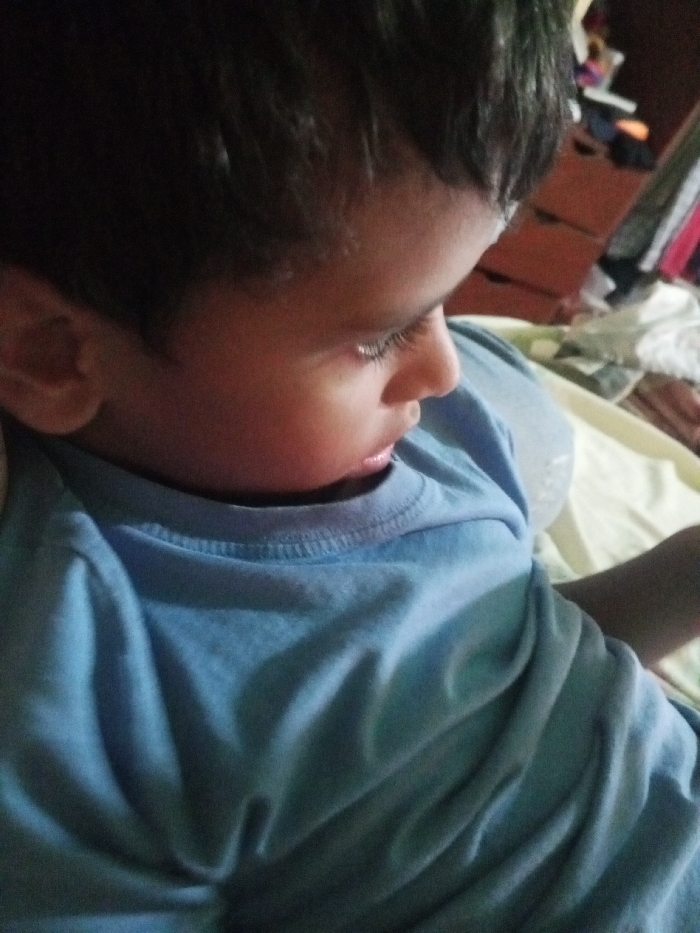 A young child is captured from a close angle, mostly in focus. The child has dark hair and brown skin. The child is wearing a light blue t-shirt. The child appears to be looking down. The background is a bedroom with a dresser visible in the upper right.