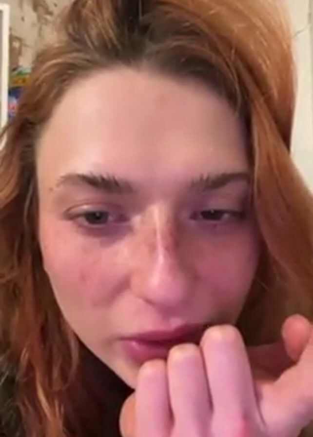 A close-up video shows a woman with long reddish-brown hair looking down. Her hand is gently placed under her chin, with her fingers slightly curled. She has freckles across her nose and cheeks, and her eyes are a light color. Her lips are moving slightly as if she is speaking. The background is out of focus, but it appears to be a room with a white wall, possibly with some kind of poster or picture. The lighting in the video seems natural.