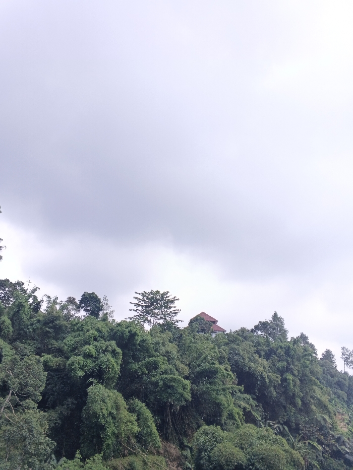 A dense, verdant hillside is covered in lush trees and vegetation under a cloudy sky. The treetops create a textured, undulating horizon line. A building with a red roof is nestled among the trees near the center. The overcast sky occupies most of the frame, casting a soft, diffused light across the scene. The overall impression is a peaceful, natural landscape.
