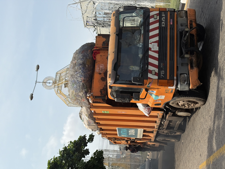 - "An orange DAF 75 300 garbage truck is depicted on an asphalt road under a clear blue sky in Itirin, Nigeria" by FM-rkm0j2, licensed under CC BY 4.0