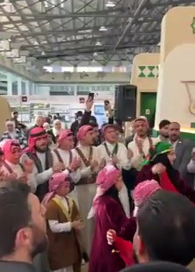 crowd of people, mostly men and boys, gathered in what appears to be a large indoor exhibition space. Most of the men and boys are wearing traditional Middle Eastern clothing, including headscarves. They are clapping and appear to be dancing or participating in some sort of celebratory activity. Two girls in the center of the group, also dressed in traditional attire, are twirling and dancing. A few people in the crowd are recording with their smartphones. Behind the group is a display that includes Arabic writing and the English words "Kingdom of Saudi Arabia." The overall atmosphere seems festive and energetic.