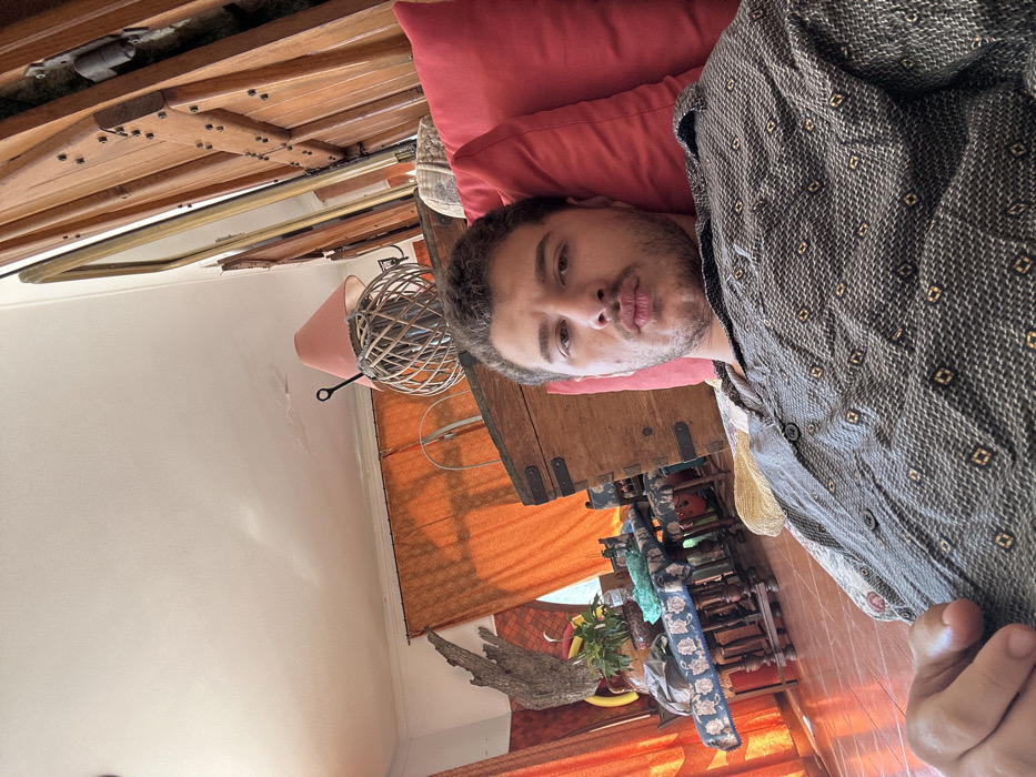 An interior scene in Cutrofiano, Italy, depicts a young adult male in a close-up, upward-angle view, appearing to take a selfie. The male subject has short, dark, curly hair and light facial hair; he wears a dark, patterned button-up shirt and puckers his lips. He reclines against two red pillows, positioned in the lower right and central frame. Behind him, a dark wooden chest with visible metal strapping and corner protectors is present. Above the chest, a lamp with a woven spherical base and a light-colored lampshade is visible. To the right, a large wooden structure, possibly a wardrobe or decorative paneling, extends vertically with visible hinges and reflections, suggesting mirrors. To the left, a room interior is visible through a gap. Orange-colored curtains cover windows, admitting natural light. A dark wooden table with an ornate base and a light-colored patterned tablecloth holds a potted plant and other indistinct objects. A large, gnarled piece of wood or root stands vertically near the windows. The floor, partially visible in the lower left, is tiled with reddish-brown tiles. The ceiling is white with minor surface irregularities.