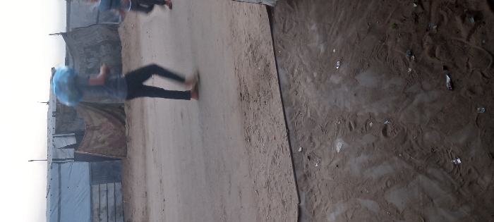 blurred person carrying a blue bag, running alongside a road. The road surface is light-colored and appears dusty. To the left of the road are makeshift dwellings constructed from various materials. To the right, a dark, sandy area is visible, containing scattered debris. The overall impression is one of poverty and disrepair.