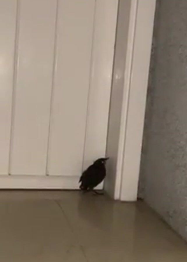 A small, dark bird is standing on a light-colored tiled floor, next to a white door and a textured, grey wall