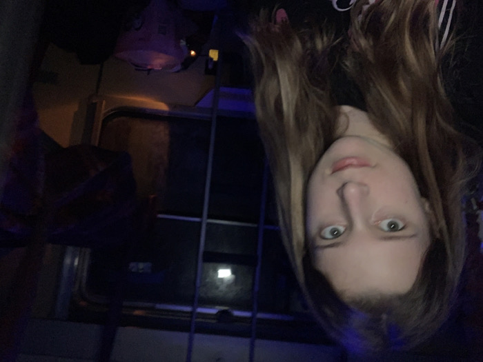 A young woman with long blonde hair and light skin faces the camera. Her expression appears surprised or inquisitive. The image is rotated, making it seem as if she's upside down. A blurred background suggests she's inside a vehicle, possibly a bus or train, with a window and luggage or bags visible. The lighting is dim with a mix of blue and yellow tones.