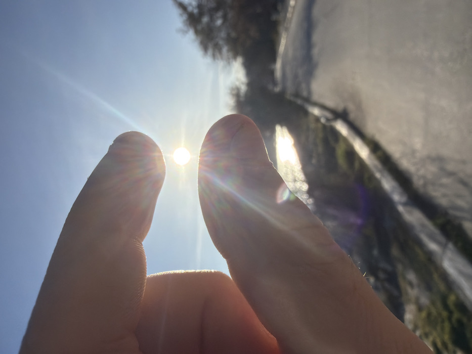 The image depicts an outdoor scene in a coastal area of Varna, Bulgaria, consistent with the Sea Garden (Morska Gradina) or a nearby promenade. The primary subject is a human hand, specifically two fingers, silhouetted in the foreground and positioned to create an optical illusion. The sun, appearing as a bright, starburst-like point of light, is precisely centered between the two fingertips, giving the impression of being 'pinched' or held. The sky above is clear and light blue, indicating daytime. The background is out of focus, showing a wide body of water, identifiable as the Black Sea, on the left, reflecting bright sunlight across its surface. To the right, a gray paved path or road curves into the distance, bordered by a low, light-colored curb or barrier. Blurred dark green vegetation and tree silhouettes are visible further in the distant background. The scene is strongly backlit by the sun, causing prominent lens flare and rendering the fingers in silhouette.