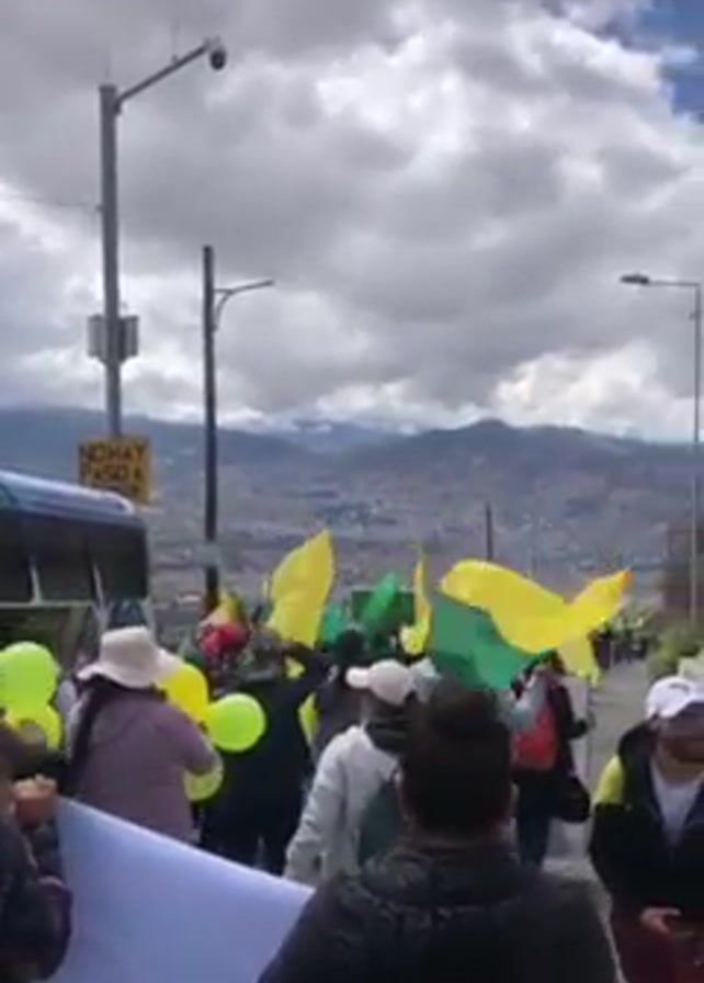 A group of people are marching on what appears to be a street or roadway. The group is diverse in appearance and they are carrying green and yellow flags, yellow balloons, and a large white banner. The mountains are visible in the background, with a cityscape visible below the mountains. The sky is overcast with some blue sky visible. A bus is parked on the side of the road, and there are streetlights and traffic signs present.