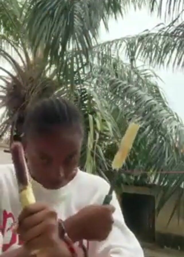 A woman with braided hair and a white t-shirt is standing outside with palm trees in the background. She is holding two pieces of sugarcane and using a knife to cut one of them. She then holds the two pieces of sugarcane in a crossed position, looking at the camera with a serious expression. The background includes a building and more greenery.