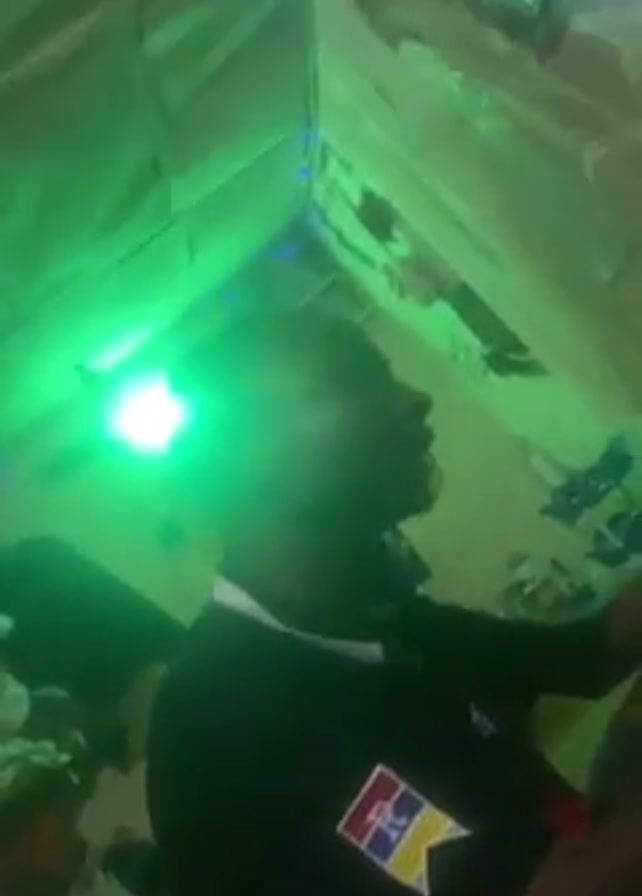 A man is standing in a small, somewhat cluttered space illuminated by green light. He is wearing a black shirt with a colorful emblem on the left side. The space appears to be enclosed, perhaps a small room or booth, with items scattered around. He speaks but the audio is not clear enough to transcribe. The environment is dim and dominated by the green light.