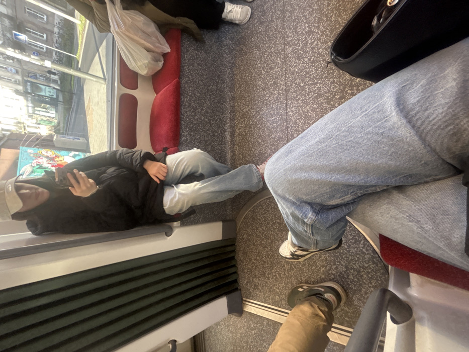 The image displays the interior of a tram in Strasbourg, France, from a passenger's vantage point. In the immediate foreground, the viewer's legs are visible, clad in light blue jeans and white and black athletic shoes. A black handbag rests to the viewer's right. In the mid-ground, a young individual is seated against a vertical support structure on the left side of the tram. This person wears a beige baseball cap, a black puffer jacket, and light blue jeans, with red shoes visible. They are focused on a dark-colored smartphone held in both hands. To their right, partially obscured, is another passenger whose lower legs and feet, wearing dark trousers and white sneakers, are visible. A clear plastic bag, containing items that appear to be foodstuffs, rests on the red upholstered seat next to this passenger. The tram's interior features gray speckled flooring, red cushioned seats with white plastic frames along the window, and white handrails. A large window spans the background, revealing the urban exterior. The outdoor scene, illuminated by bright sunlight, includes multi-story buildings with various windows, typical of European architecture. A colorful mural featuring cartoon-like imagery is visible on a building wall across the street. Street furniture and signage, including a blue rectangular sign with a white arrow and another sign displaying the word "Audience," are present. Reflections of the tram's interior and passengers are visible on the exterior glass.