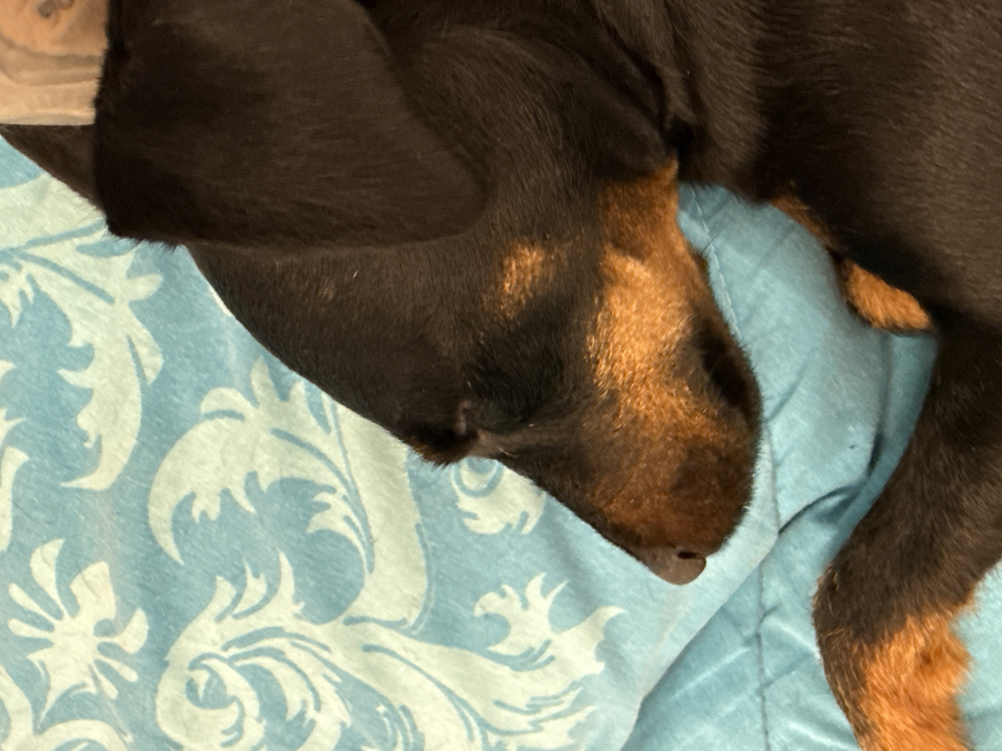 - "A close-up overhead shot shows a black and tan dachshund dog sleeping on a light blue quilt with a swirling white pattern" by FM-ggqTz2, licensed under CC BY 4.0