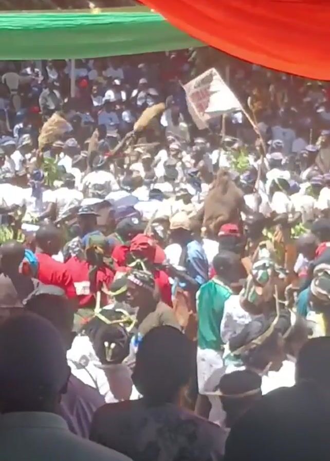 A crowd of people has gathered under a green and red awning, the majority wearing white shirts. Individuals in traditional clothing, including some with animal hides and headwear, move through the crowd, some holding spears or staffs. A flag with lettering is visible amid the throng. The scene appears to be outdoors, with bright sunlight. The view is from the back of the crowd, looking towards the central activity.